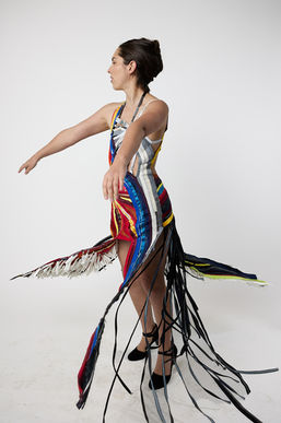 Callisto, a transforming dress made with dance costume straps and thread spools. My friend modeled this dress at a show in Austin TX, pulling off the transformation flawlessly! I spent around one year working on this dress, over half of it was hand sewn and every piece was placed strategically. The dress is meant to be worn in two ways; up with the white thread cones for a fun flapper-esque design, or down as a more elegant and colorful option. I utilized hundreds of thread cones to create the “sequins” underneath: hand cutting, drilling, and adding two jump rings to each piece.